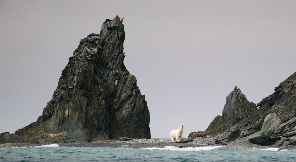 A polar bear waits by on a beach near sea stacks on Russia’s Herald Island in August, for the return of the sea ice. The retreat of the summer ice in the western Chukchi Sea has concentrated hundreds of polar bears on this island and nearby Wrangell, so personal space for these non-social bears is limited. Climate change in the Bering region of the Arctic has greatly delayed the return of the sea ice hunting habitat in the autumn months, lengthening the starvation period for polar bears here, one of highest concentrations of the Arctic animals anywhere on earth.